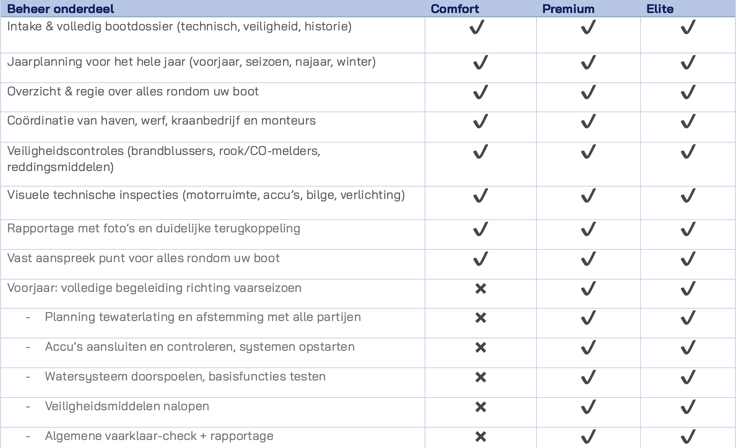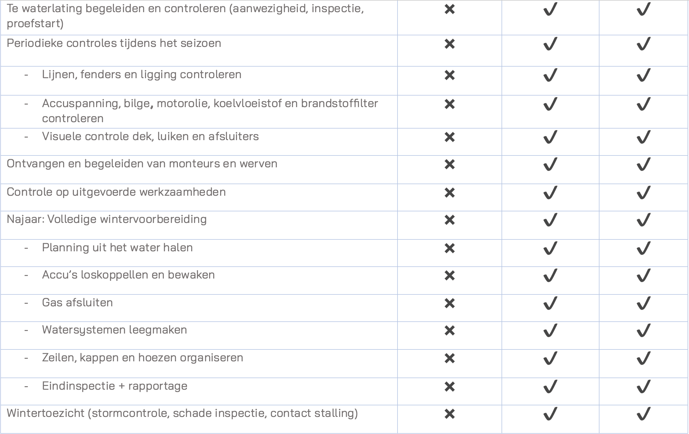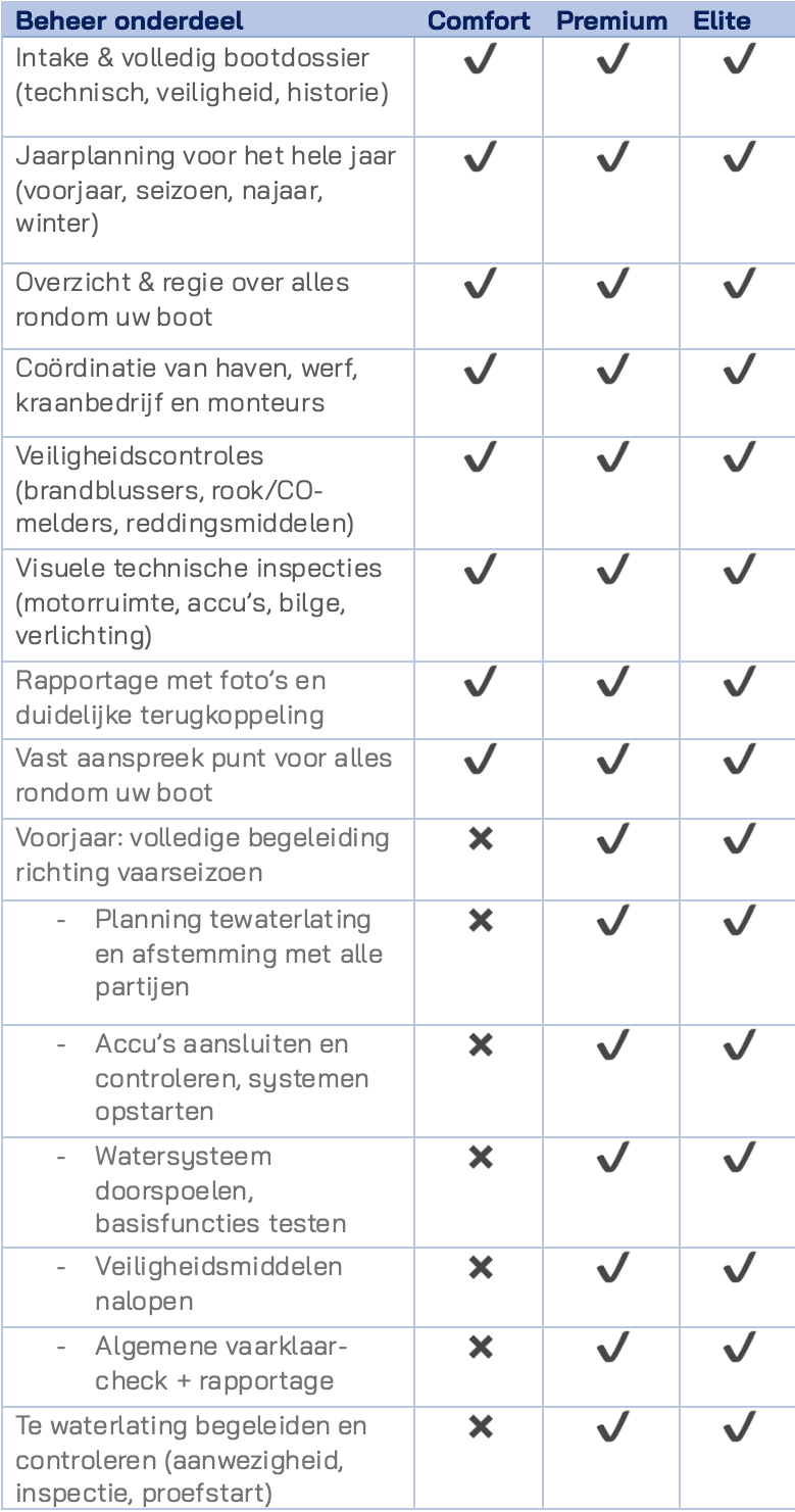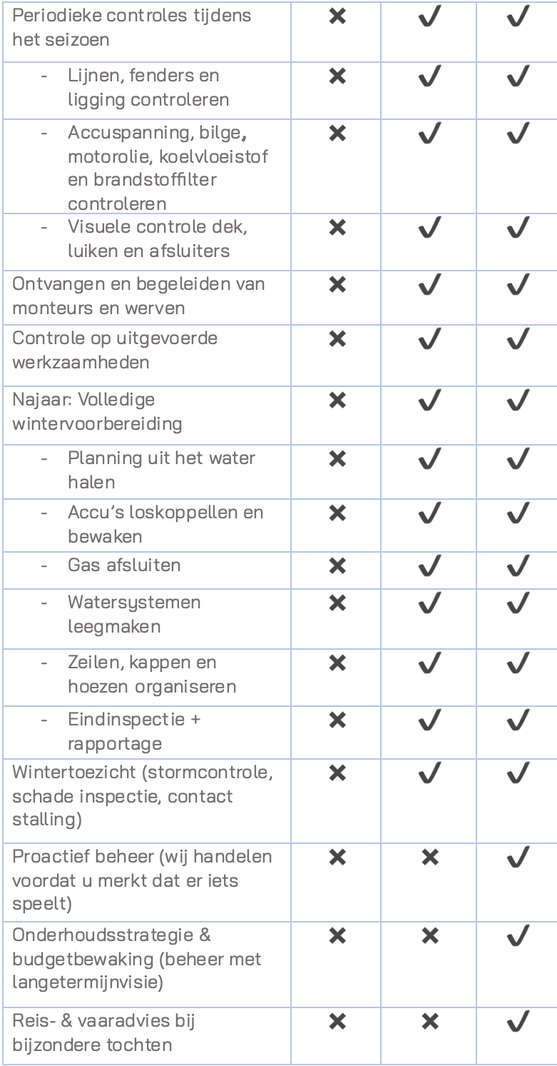 Ze bevatten geen uitvoerend technisch werk aan de boot, wel coördineren wij dit werk in overleg.
